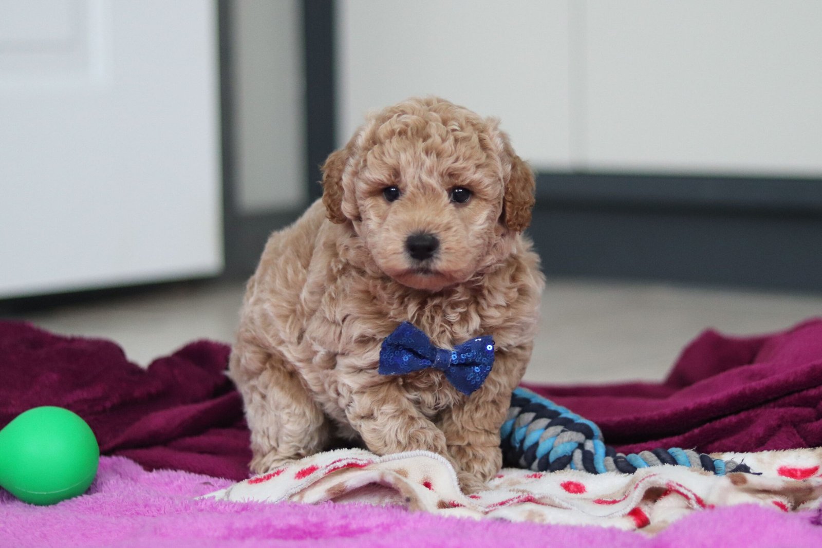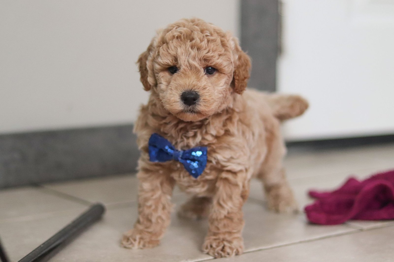 Meet Howie, an adorable F1B Mini Goldendoodle with a sweet, loving personality and plenty of charm. His soft, fluffy coat, bright expressive eyes, and happy little trot make him hard to resist. Howie loves exploring his surroundings, making new friends, and soaking up attention, and his gentle, friendly nature makes him a joy to have around.