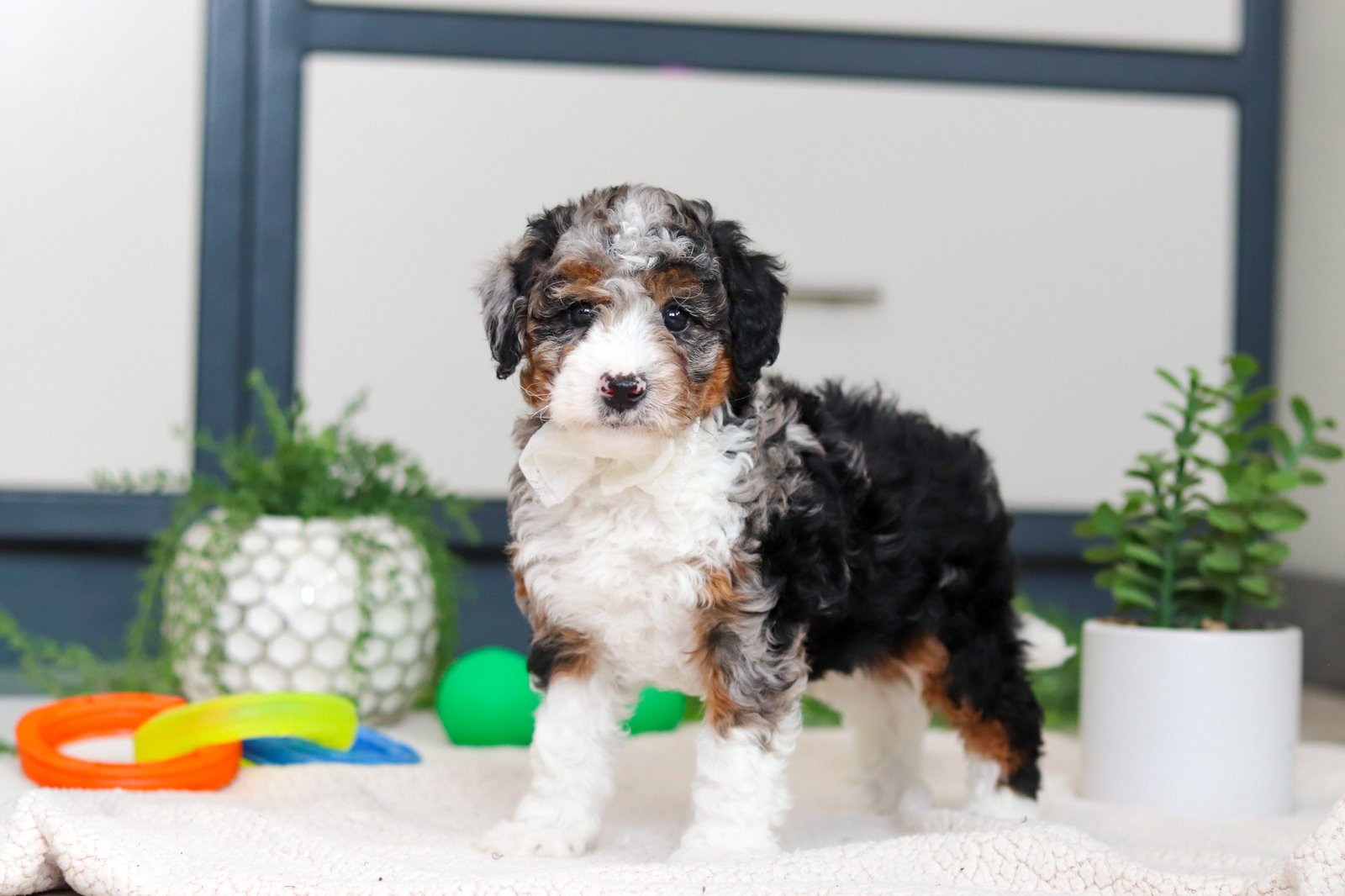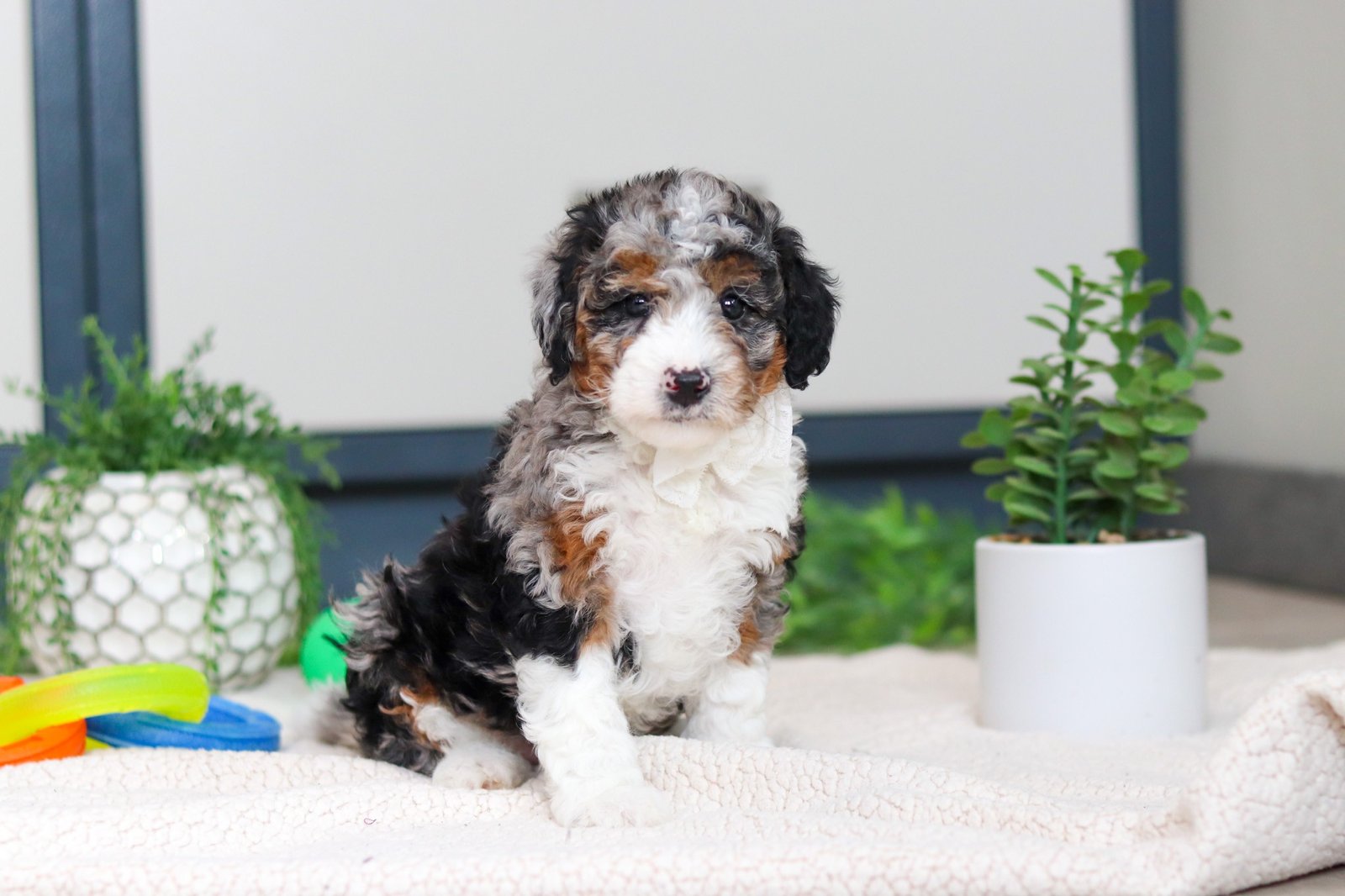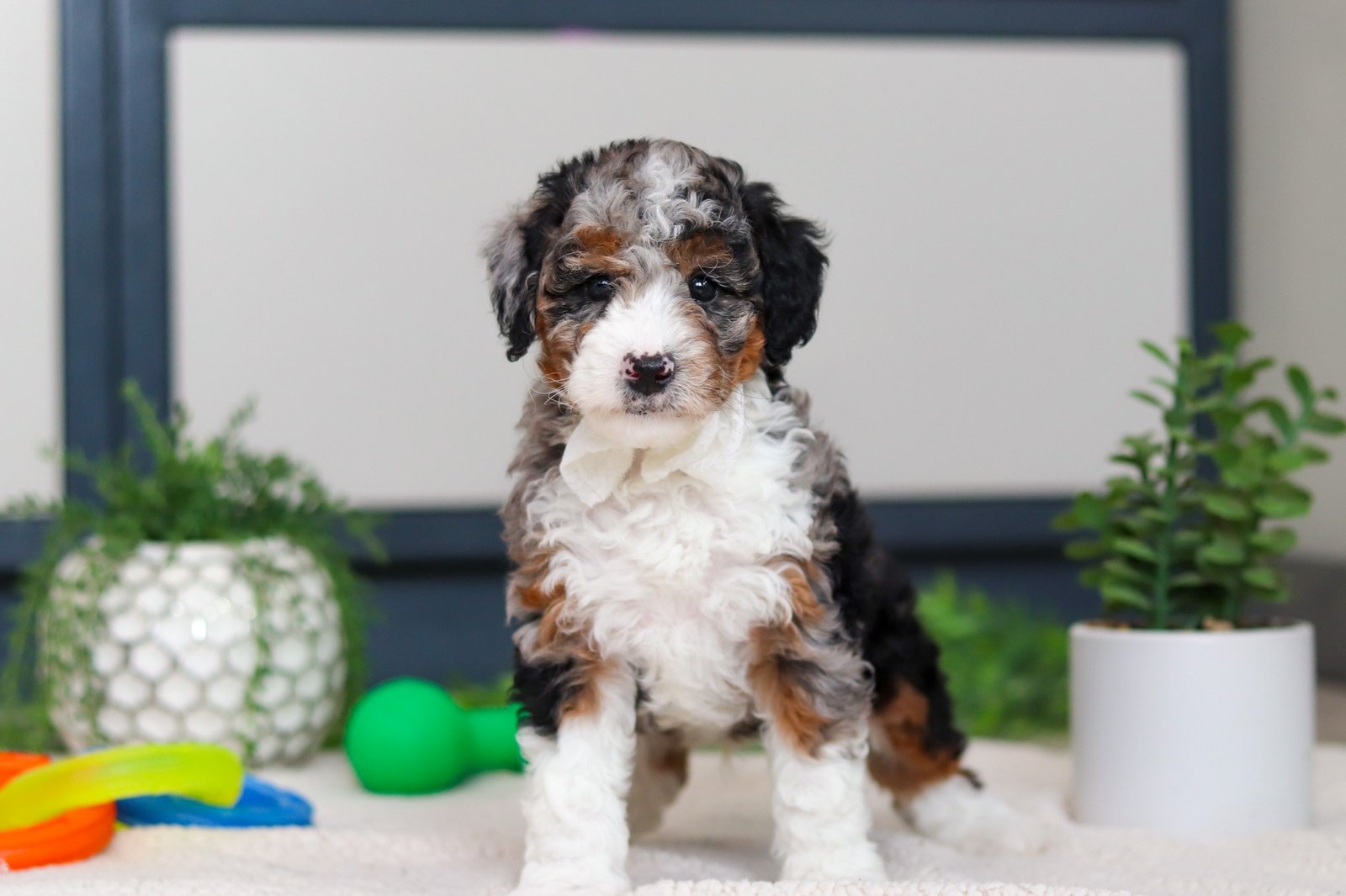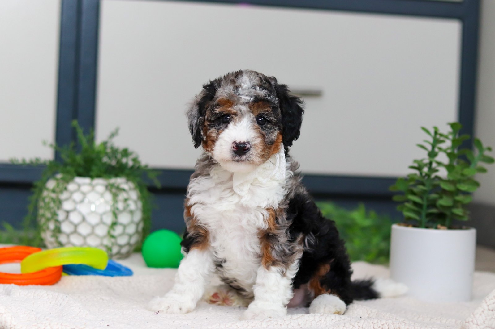 Introducing Jasper, a beautiful F1B Mini Bernedoodle puppy—full of personality and ready to melt your heart! He’s the perfect blend of the Bernese Mountain Dog’s gentle nature and the Poodle’s intelligence. Bernedoodles are well known for their affectionate, loyal, and playful spirit, making them wonderful companions for families or individuals alike. Whether it’s romping in the yard, going for a walk, or curling up for a nap, he’ll be happiest just being by your side. These pups are also quick learners who thrive on love, attention, and plenty of interaction!