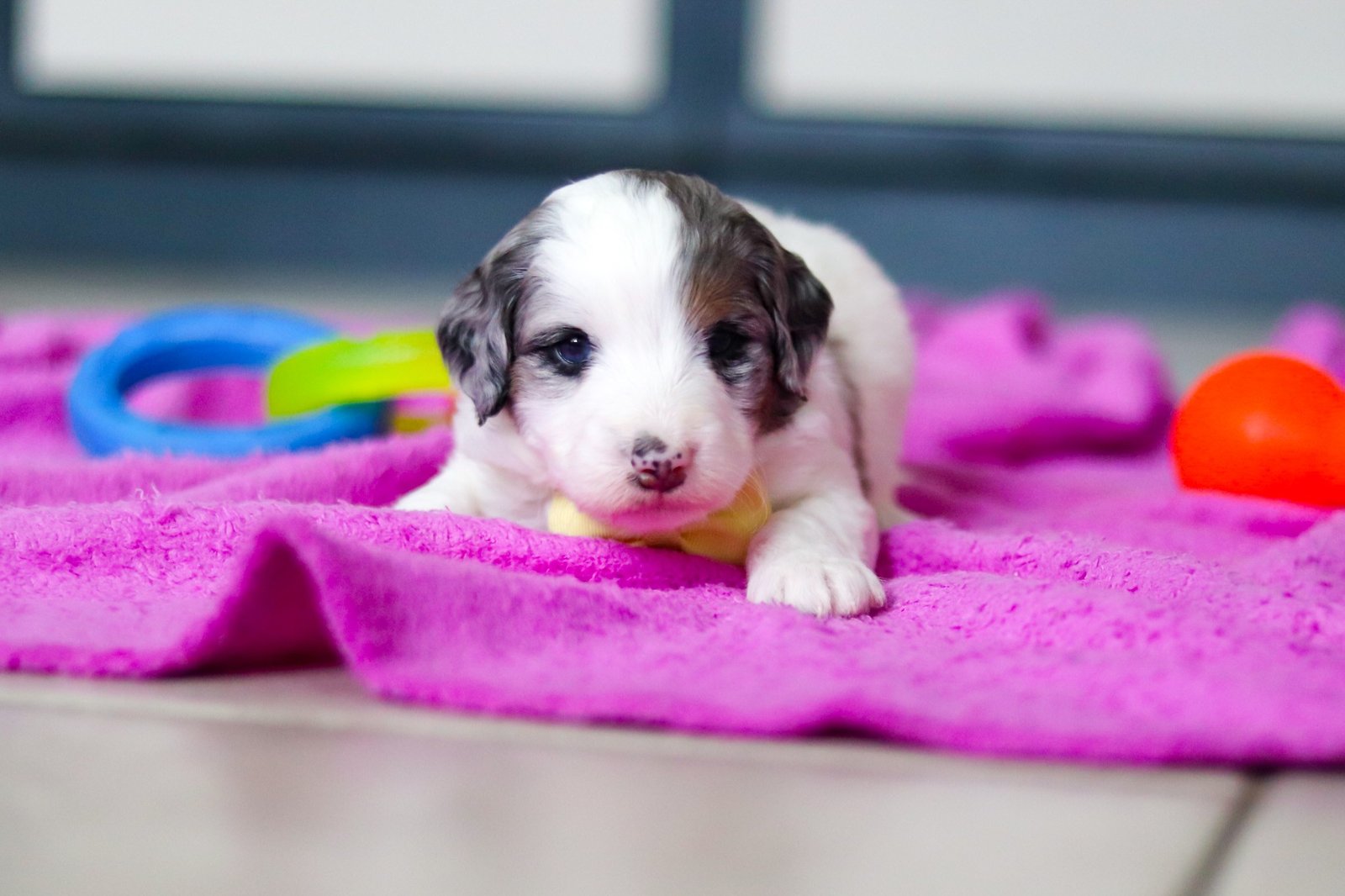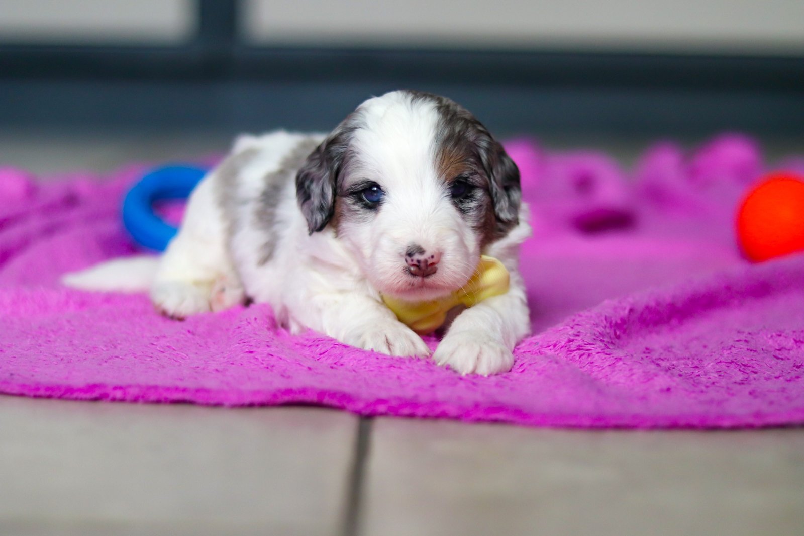 His dad, Hawkeye is a striking Mini Poodle with a confident, outgoing personality. Hawkeye weighs 22 lbs. The mama, Candy is as gentle and sweet as they come. She is stunning F1 Mini Bernedoodle who adores snuggles, belly rubs, and has a calm, loving temperament that she passes down to her puppies. Candy weighs 28 lbs.