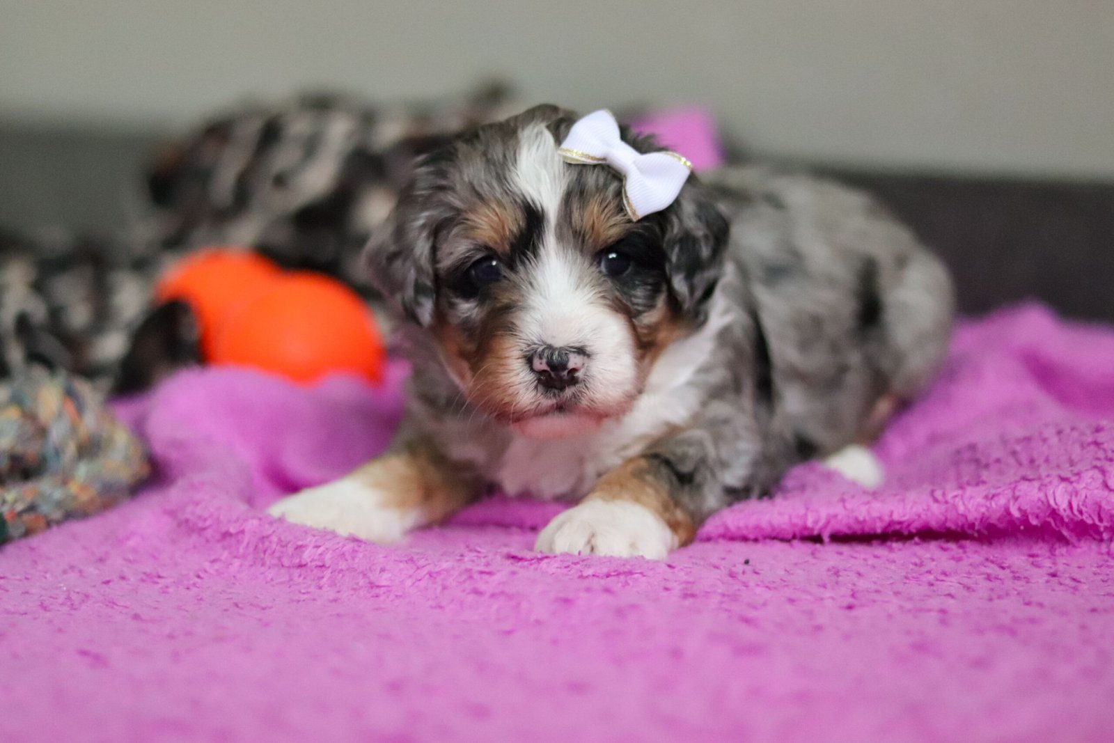 Her dad, Hawkeye is a striking Mini Poodle with a confident, outgoing personality. Hawkeye weighs 22 lbs. The mama, Candy is as gentle and sweet as they come. She is stunning F1 Mini Bernedoodle who adores snuggles, belly rubs, and has a calm, loving temperament that she passes down to her puppies. Candy weighs 28 lbs.