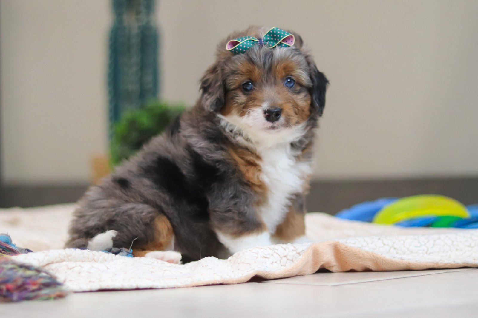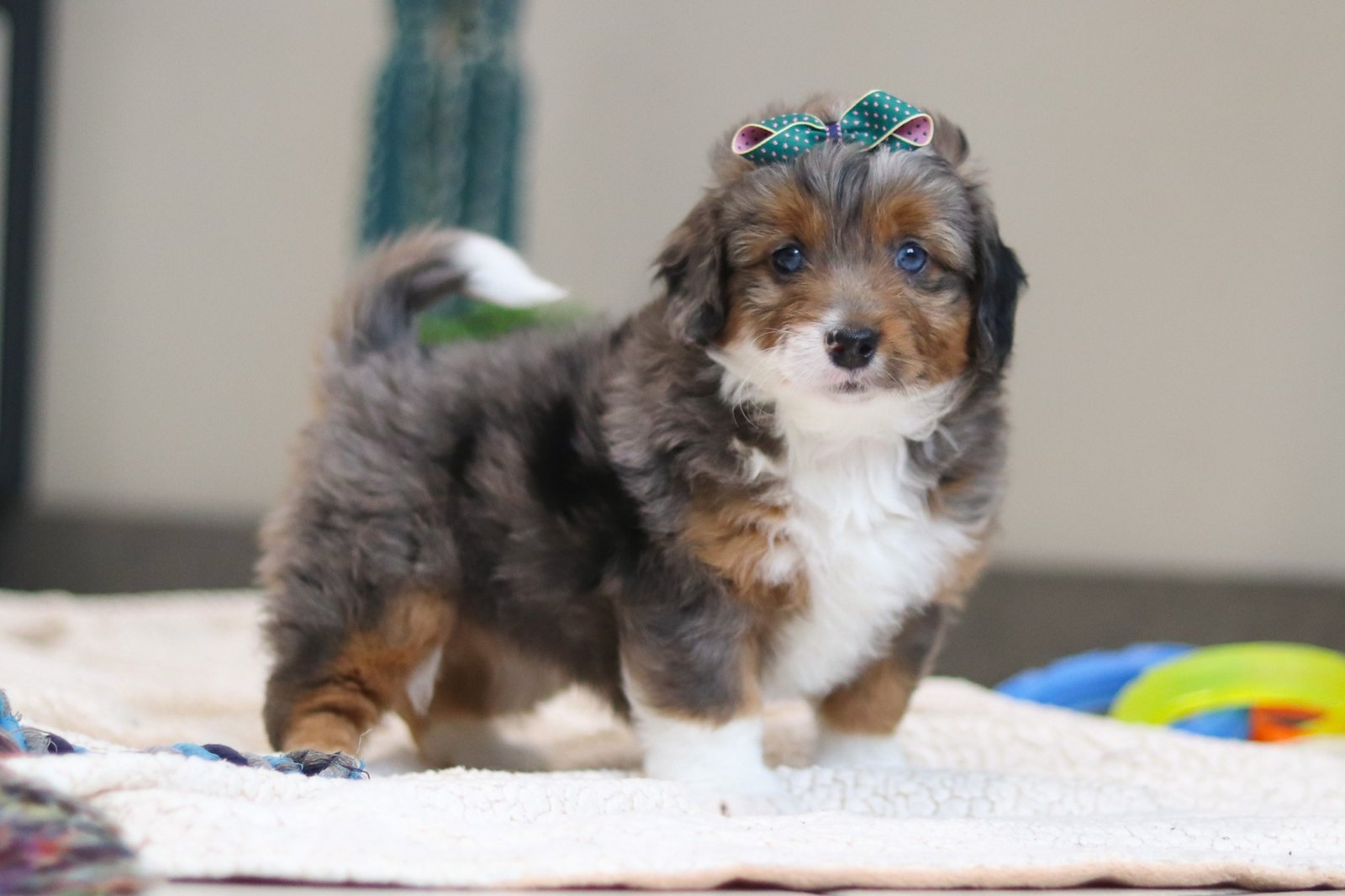 Hi there! I’m Paige, a super cute Bernedoodle with fluffy fur that’s perfect for snuggles. I love playing with my toys, exploring new places, and meeting new friends—I’m full of energy and curiosity! When I get tired from all my adventures, I snuggle up for cuddles and give lots of puppy kisses. I promise to bring lots of love, laughter, and wagging tails to my forever family, and I can’t wait to meet you and start our fun-filled life together!